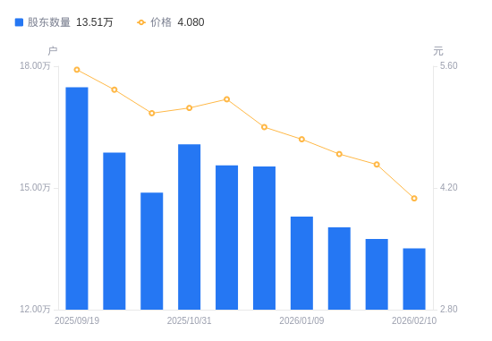 近一年(2025年2月10日至2026年2月10日),春兴精工A股股东户数从14.69万户,减低至13.51万户,降幅8.03%,区间股价下跌10.92%。