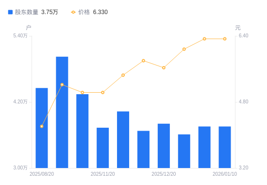 近一年(2025年1月27日至2026年1月9日),金新农A股股东户数从4.6万户,减低至3.75万户,降幅18.41%,区间股价上涨64.42%。
