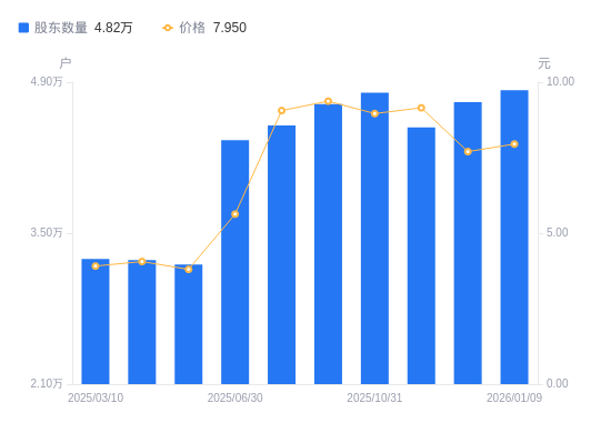 近一年(2025年1月20日至2026年1月9日),天沃科技A股股东户数从3.32万户,增加至4.82万户,增幅45.30%,区间股价上涨85.75%。