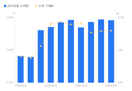 1月29日消息,数据显示,截至2026年1月20日,天沃科技A股股东总户数为4.79万户,较上期(2026年1月9日)减少324户,降幅0.67%。公司最新A股总股本为8.59亿股,其中流通A股8.59亿股,户均持有流通A股数量为1.79万股,较上期增加120.36股,增幅0.68%;户均持流通A股市值14.32万元,较上期增加1673.81元,增幅1.18%。