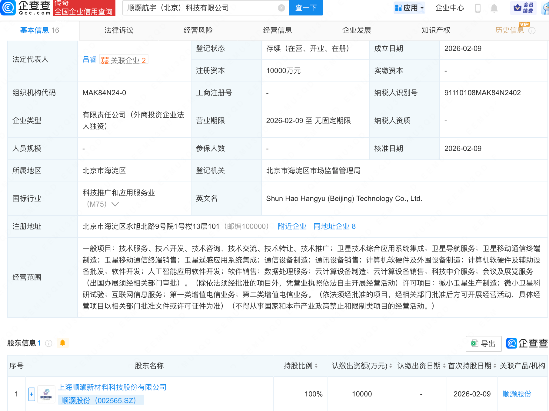 企查查APP显示,近日,顺灏航宇(北京)科技有限公司成立,注册资本1亿元,经营范围包含:卫星技术综合应用系统集成;卫星导航服务;卫星移动通信终端制造;卫星移动通信终端销售;卫星遥感应用系统集成等。企查查股权穿透显示,该公司由顺灏股份(002565)(002565.SZ)全资持股。