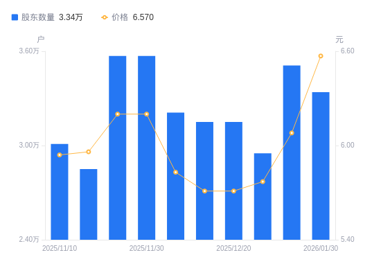 近一年(2025年2月10日至2026年1月30日),明牌珠宝A股股东户数从2.1万户,增加至3.34万户,增幅59.05%,区间股价上涨40.99%。