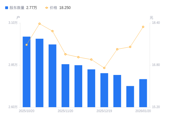 近一年(2025年1月20日至2026年1月20日),通达动力A股股东户数从3.58万户,减低至2.77万户,降幅22.65%,区间股价上涨30.17%。