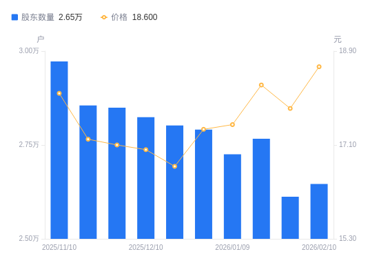 近一年(2025年2月20日至2026年2月10日),通达动力A股股东户数从3.8万户,减低至2.65万户,降幅30.45%,区间股价上涨17.28%。