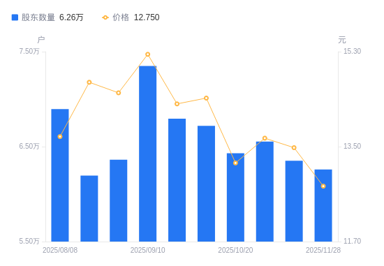 近一年(2024年11月29日至2025年11月28日),圣阳股份A股股东户数从5.53万户,增加至6.26万户,增幅13.22%,区间股价上涨44.23%。