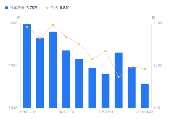 近一年(2025年2月10日至2026年1月30日),山东章鼓A股股东户数从3.63万户,增加至3.78万户,增幅4.13%,区间股价上涨2.07%。