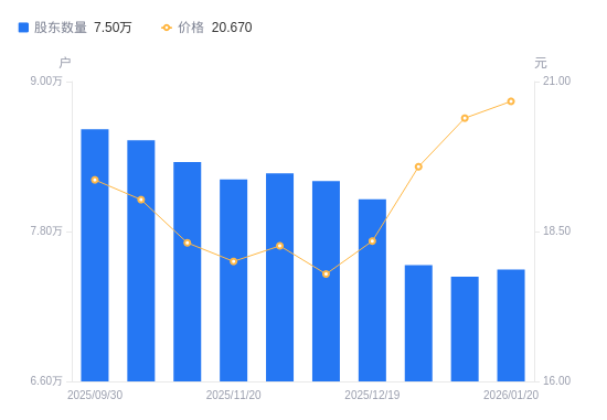 2月3日消息,数据显示,截至2026年1月20日,龙佰集团A股股东总户数为7.5万户,较上期(2026年1月9日)增加572户,增幅0.77%。公司最新A股总股本为23.84亿股,其中流通A股19.88亿股,户均持有流通A股数量为2.65万股,较上期减少203.94股,降幅0.76%;户均持流通A股市值54.81万元,较上期增加3266.93元,增幅0.60%。