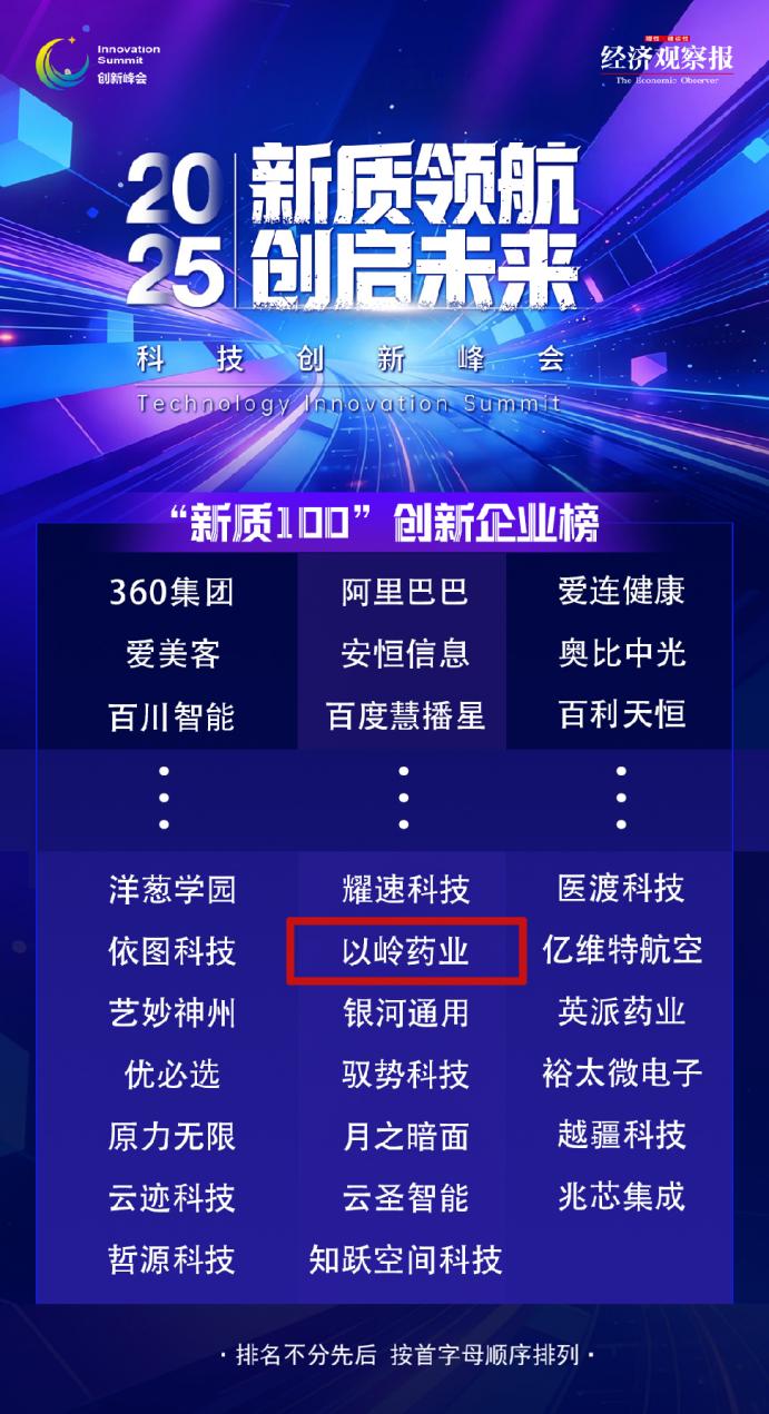 1月30日,在经济观察报社举办的2025年度创新峰会上,重磅发布了“新质100”创新企业榜,以岭药业以其在新质生产力方面的卓越表现荣登榜单。