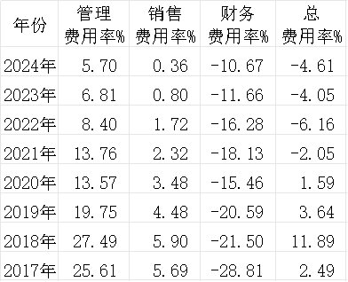 把这些费用率放一起看,总费用率从2017年的2.49%一路波动,到2024年变成-4.61%,整体保持负值或低位,这意味着公司整体上费用控制得相当出色,甚至费用还低于收入,形成持续流入态势。