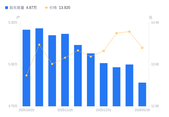 近一年(2025年2月10日至2026年1月30日),安洁科技A股股东户数从5.2万户,减低至4.87万户,降幅6.35%,区间股价下跌13.33%。