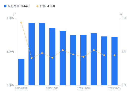 1月6日消息,数据显示,截至2025年12月31日,公元股份A股股东总户数为3.44万户,较上期(2025年12月19日)减少158户,降幅0.46%。公司最新A股总股本为12.29亿股,其中流通A股11.34亿股,户均持有流通A股数量为3.29万股,较上期增加150.36股,增幅0.46%;户均持流通A股市值14.22万元,较上期增加649.55元,增幅0.46%。