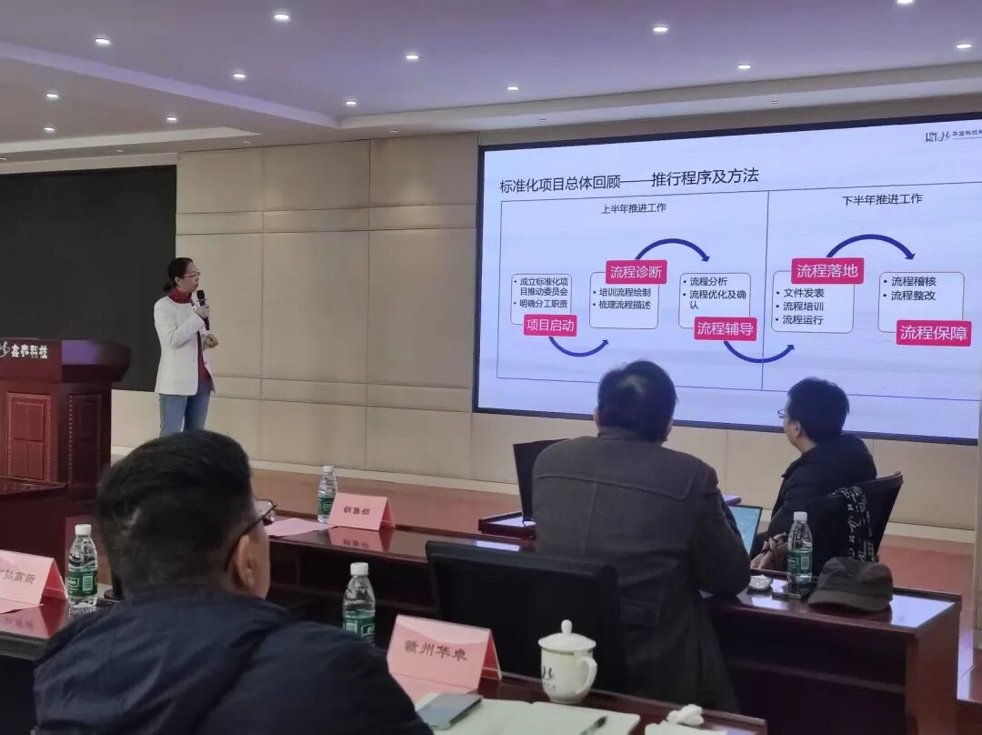 会议伊始,标准化工作负责人,稀土事业部副总经理兼财务总监姚莉女士作年度成果报告,围绕总体回顾、成果介绍、心得体会、问题剖析、未来计划五方面系统梳理成果:全年完成修订及建立流程147项、表单及建立表格198份、修订及建立流程文件96份、修订及建立管理程序51份,推动组织内外培训、辅导及稽核二十余次;搭建跨部门联动机制,解决多项历史协同难题,为后续标准化工作明确“体系化、精细化、价值化”升级方向。