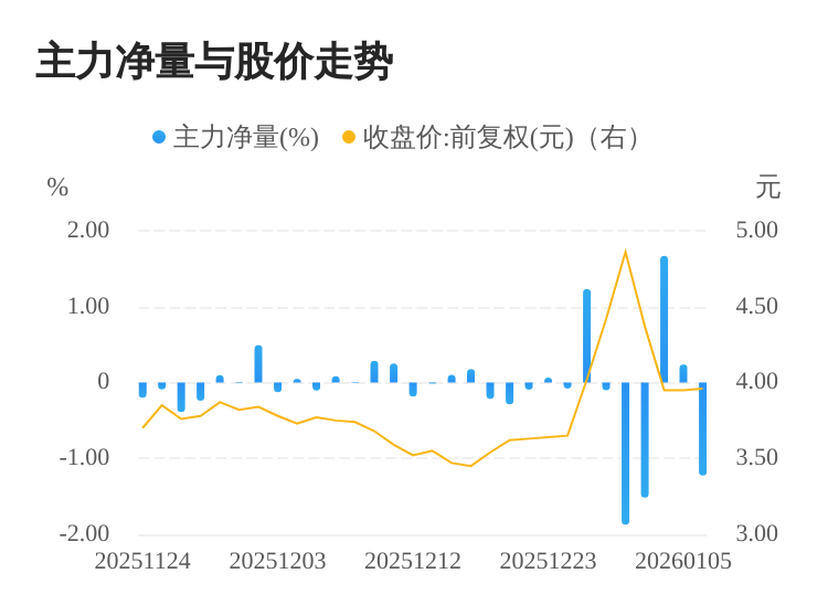 扬子新材(002652)01月06日主力(dde大单净额)净流出2488.89万元,涨跌幅为0.25%,主力净量(dde大单净额/流通股)为-1.23%,两市排名5112/5183。