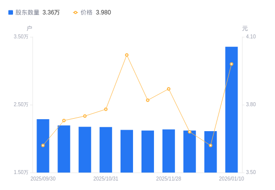 近一年(2025年1月10日至2026年1月10日),扬子新材A股股东户数从2.56万户,增加至3.36万户,增幅31.17%,区间股价上涨44.73%。
