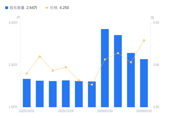 近一年(2025年2月10日至2026年2月10日),扬子新材A股股东户数从2.55万户,增加至2.64万户,增幅3.72%,区间股价上涨42.62%。
