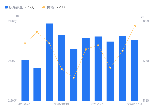 1月13日消息,数据显示,截至2026年1月9日,凯文教育A股股东总户数为2.42万户,较上期(2025年12月31日)减少912户,降幅3.64%。公司最新A股总股本为5.98亿股,其中流通A股5.98亿股,户均持有流通A股数量为2.47万股,较上期增加899.52股,增幅3.77%;户均持流通A股市值15.42万元,较上期增加1.44万元,增幅10.32%。