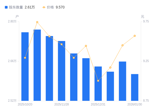 近一年(2025年2月10日至2026年1月30日),克明食品A股股东户数从3.09万户,减低至2.61万户,降幅15.42%,区间股价上涨2.46%。