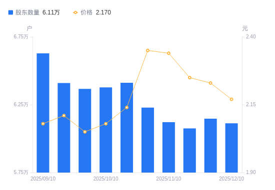 近一年(2024年12月31日至2025年12月10日),普邦股份A股股东户数从7.53万户,减低至6.11万户,降幅18.79%,区间股价上涨6.90%。