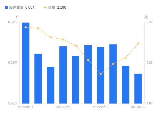 近一年(2025年2月28日至2026年2月10日),普邦股份A股股东户数从7.24万户,减低至6.05万户,降幅16.44%,区间股价上涨16.49%。