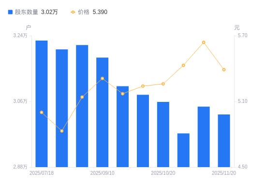 11月25日消息,数据显示,截至2025年11月20日,德联集团A股股东总户数为3.02万户,较上期(2025年11月10日)减少214户,降幅0.70%。公司最新A股总股本为7.88亿股,其中流通A股5.01亿股,户均持有流通A股数量为1.66万股,较上期增加116.31股,增幅0.71%;户均持流通A股市值8.92万元,较上期减少3482.58元,降幅3.76%。