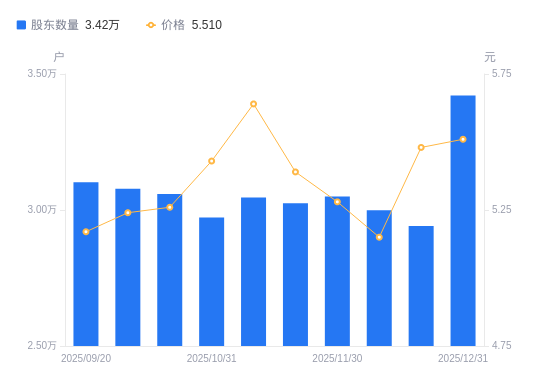 近一年(2024年12月31日至2025年12月31日),德联集团A股股东户数从3.22万户,增加至3.42万户,增幅6.17%,区间股价上涨26.67%。