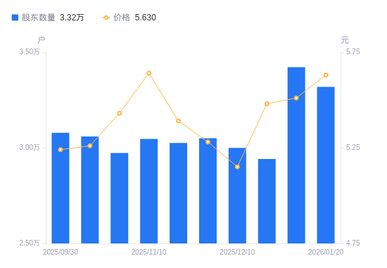 近一年(2025年1月20日至2026年1月20日),德联集团A股股东户数从3.54万户,减低至3.32万户,降幅6.30%,区间股价上涨17.54%。