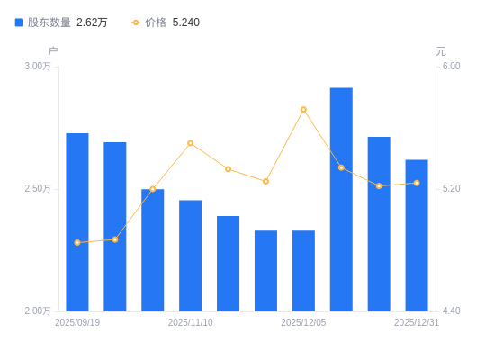 近一年(2024年12月31日至2025年12月31日),龙泉股份A股股东户数从2.65万户,减低至2.62万户,降幅0.98%,区间股价上涨14.91%。