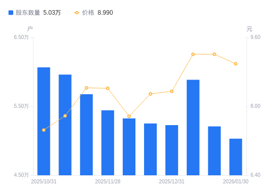 近一年(2025年2月28日至2026年1月30日),浙江美大A股股东户数从6.99万户,减低至5.03万户,降幅28.06%,区间股价上涨18.13%。
