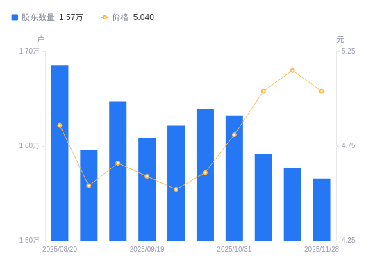 近一年(2024年11月29日至2025年11月28日),乔治白A股股东户数从2.03万户,减低至1.57万户,降幅22.90%,区间股价上涨5.88%。