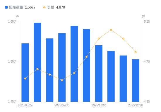 近一年(2024年12月10日至2025年12月10日),乔治白A股股东户数从2.07万户,减低至1.56万户,降幅24.69%,区间股价上涨0.41%。