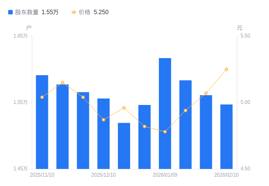 近一年(2025年2月10日至2026年2月10日),乔治白A股股东户数从1.87万户,减低至1.55万户,降幅17.32%,区间股价上涨17.71%。