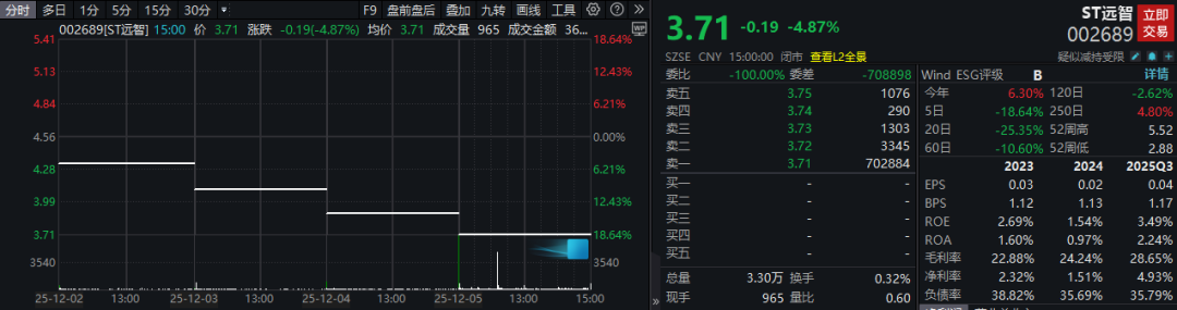 今日,ST远智(002689)(002689)股价开盘再度“一字”跌停。截至收盘,该股股价收跌4.87%,报3.71元/股。自12月2日公司股票被实施其他风险警示以来,ST远智股价已连续走出四个“一字”跌停。