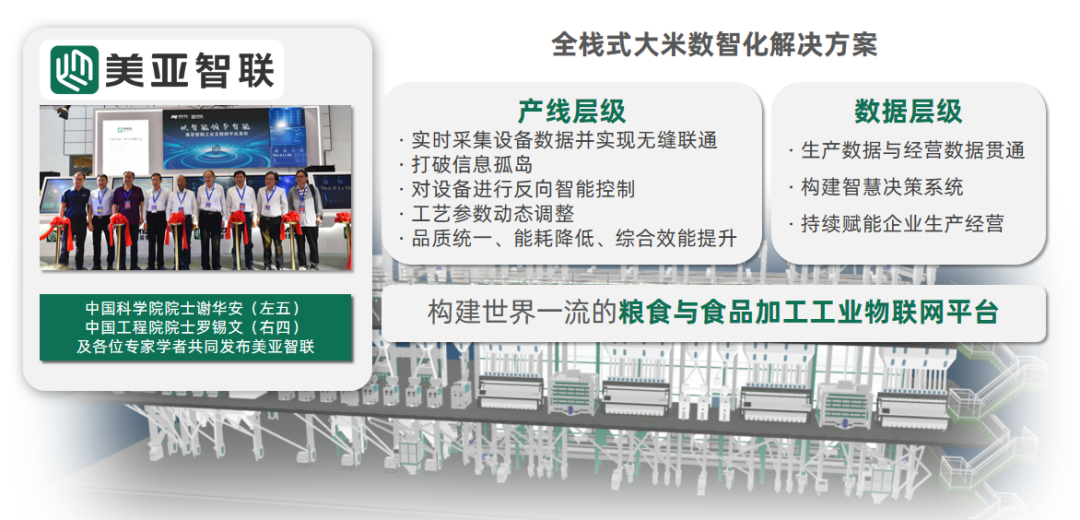 美亚光电新一代粮食分选智能体,深度融合了AI、大模型、物联网、大数据等前沿技术,把管理者的经验、技术和工艺,变成了机器的智慧,具备自我管理的能力(智能感知、智能决策、智能进化),实现粮食分选品质精准可控、设备异常智能提醒、运行自动调节等功能。