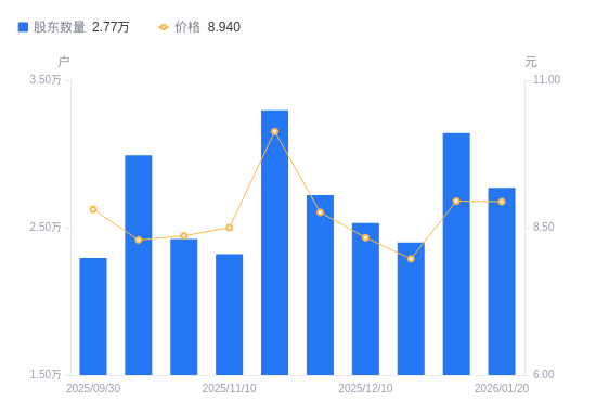 1月30日消息,数据显示,截至2026年1月20日,冀凯股份A股股东总户数为2.77万户,较上期(2026年1月9日)减少3721户,降幅11.84%。公司最新A股总股本为3.4亿股,其中流通A股3.36亿股,户均持有流通A股数量为1.21万股,较上期增加1436.2股,增幅13.43%;户均持流通A股市值10.84万元,较上期增加1.27万元,增幅13.31%。