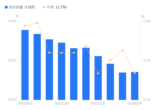 近一年(2025年2月10日至2026年1月30日),煌上煌A股股东户数从4.33万户,减低至3.18万户,降幅26.59%,区间股价上涨42.77%。
