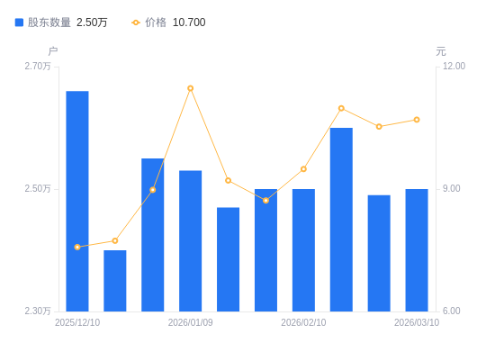 3月11日消息,数据显示,截至2026年3月10日,*ST东易A股股东总户数为2.5万户,较上期(2026年2月27日)增加100户,增幅0.40%。公司最新A股总股本为9.51亿股,其中流通A股5.27亿股,户均持有流通A股数量为2.11万股,较上期减少84.58股,降幅0.40%;户均持流通A股市值22.53万元,较上期增加2689.59元,增幅1.21%。
