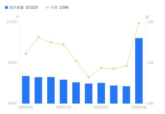 近一年(2025年2月10日至2026年1月30日),金一文化A股股东户数从2.89万户,增加至10.02万户,增幅246.92%,区间股价上涨41.90%。
