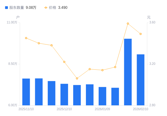 2月11日消息,数据显示,截至2026年2月10日,金一文化A股股东总户数为9.08万户,较上期(2026年1月30日)减少9422户,降幅9.40%。公司最新A股总股本为26.59亿股,其中流通A股26.59亿股,户均持有流通A股数量为2.93万股,较上期增加2754.65股,增幅10.38%;户均持流通A股市值10.22万元,较上期增加6959.67元,增幅7.30%。
