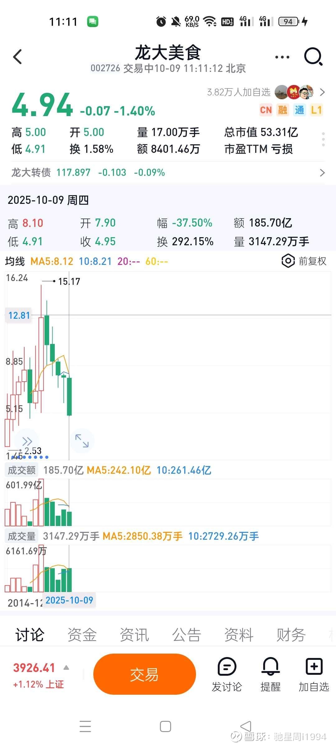 这两个需要化债的公司,都是挖坑后,放量+反弹。不过灵康药业反弹的有点猛,昨天是最后的加仓机会了。龙大美食还在底部趴着,放出大量,我进了。