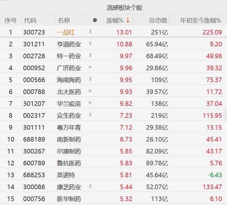 格隆汇11月25日|流感季提前到来,A股市场流感概念股活跃。其中,一品红涨13%,亨迪药业涨近11%,特一药业、广济药业、海南海药、北大医药10CM涨停,华兰疫苗涨近10%,众生药业、粤万年青涨超7%,南新制药涨超6%,尔康制药、鲁抗医药、英诺特、康芝药业、新华制药涨超5%。