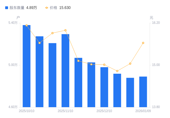近一年(2025年1月20日至2026年1月9日),电光科技A股股东户数从5.95万户,减低至4.89万户,降幅17.81%,区间股价下跌16.33%。