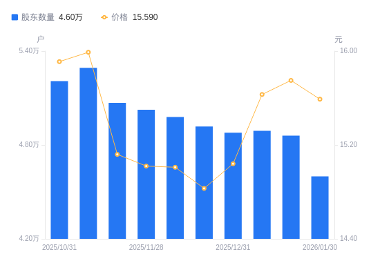 2月2日消息,数据显示,截至2026年1月30日,电光科技A股股东总户数为4.6万户,较上期(2026年1月20日)减少2606户,降幅5.36%。公司最新A股总股本为3.62亿股,其中流通A股3.46亿股,户均持有流通A股数量为7523.21股,较上期增加403.4股,增幅5.67%;户均持流通A股市值11.73万元,较上期增加5149.78元,增幅4.59%。