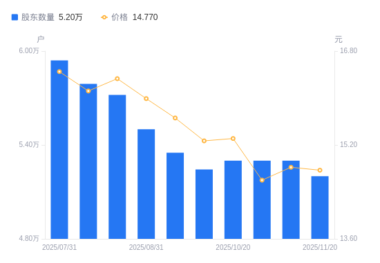 近一年(2024年12月31日至2025年11月20日),葵花药业A股股东户数从4.99万户,增加至5.2万户,增幅4.13%,区间股价下跌27.95%。
