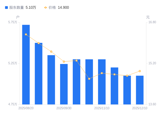 近一年(2024年12月31日至2025年12月10日),葵花药业A股股东户数从4.99万户,增加至5.1万户,增幅2.13%,区间股价下跌27.32%。