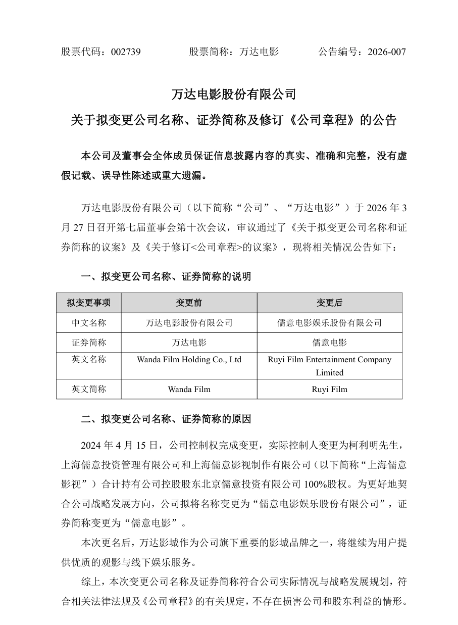 IT之家3月28日消息,万达电影(002739)股份有限公司昨天召开第七届董事会第十次会议,拟将公司名称变更为“儒意电影娱乐股份有限公司”,证券简称同步变更成“儒意电影”。