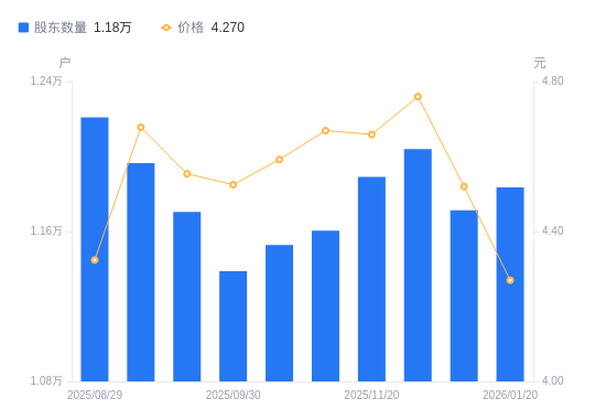 近一年(2025年1月31日至2026年1月20日),*ST三圣A股股东户数从1.22万户,减低至1.18万户,降幅2.99%,区间股价上涨17.47%。