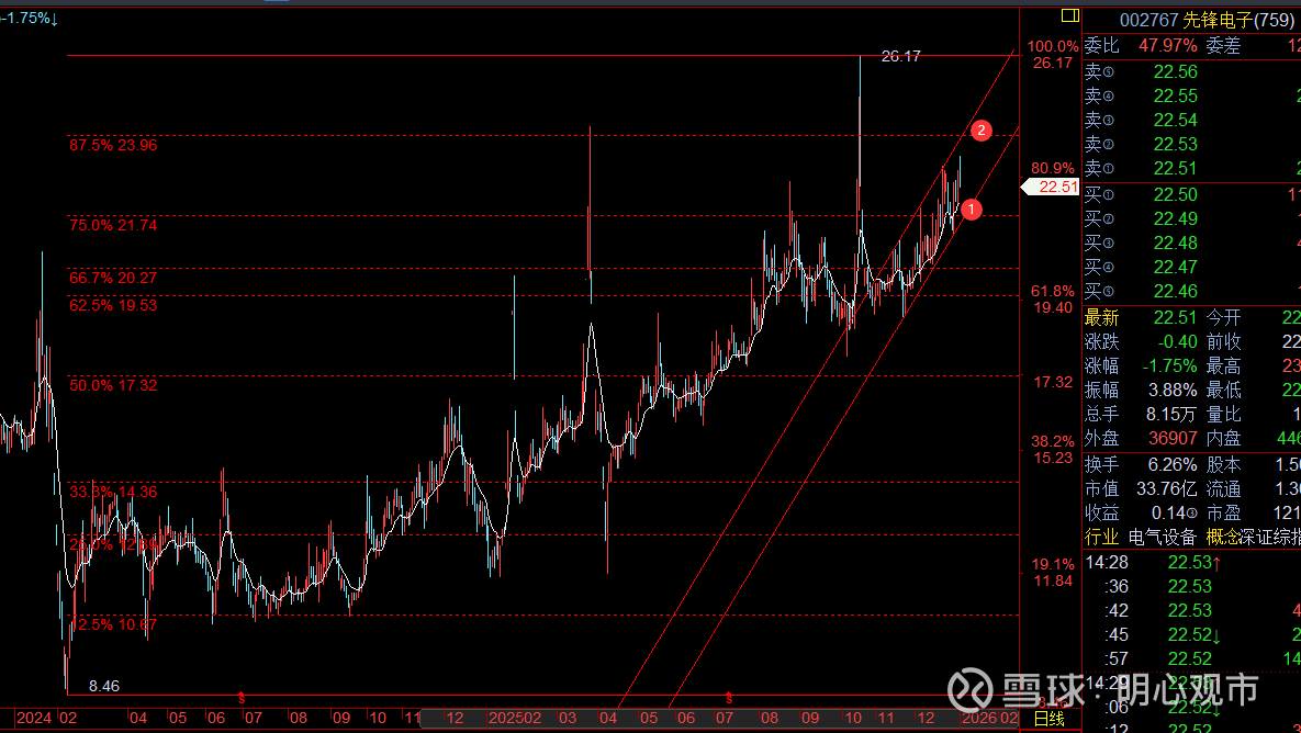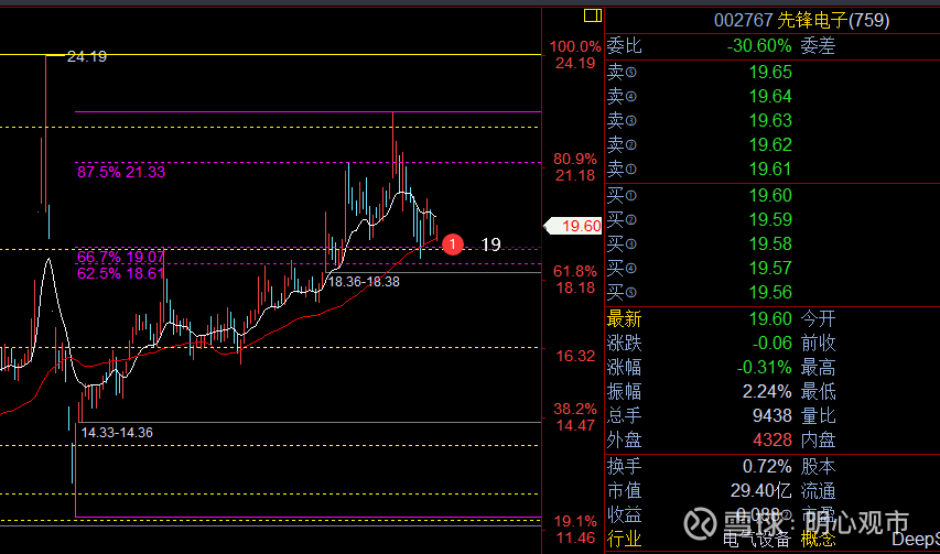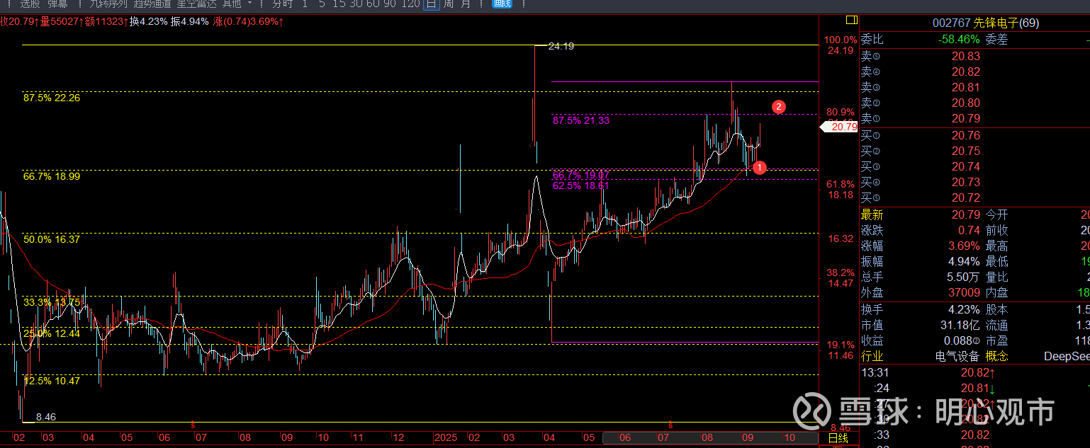 先锋电子,还是熟悉的老朋友,一动就好加速的主~这里看一张周图:趋势,红白两条多空线对应13.3-13.18上看多,价格叠加百分比显示,53.75下跌的875位对应14,近循环的半分对应14.56,14-14.56构成当前价格关键区;能突破站到14.56上方,则波段有去19.25-19.68的预期。当前支撑14,短压14.56,突破...