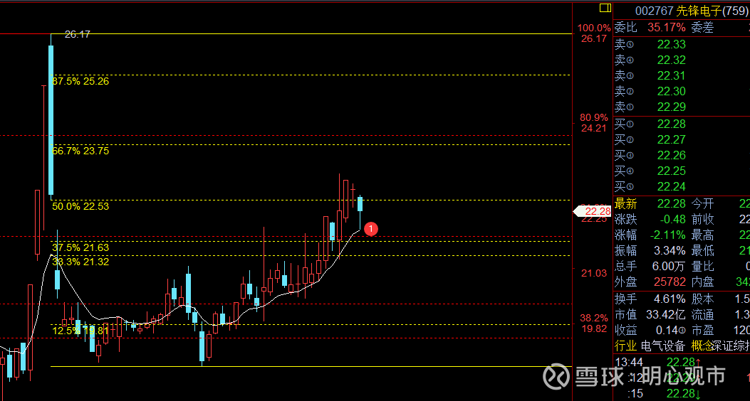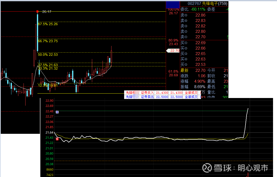 昨天收盘破白线和21.7,我右侧仓走掉的。左侧冲半分22.5是一个点,右侧破白线,则短趋势转弱,就先执行纪律。这是我的交易信号~ 他这里短期转弱,但波段趋势还在。短期弱我就先调出来做别的。你要结合自己的思路,不同的仓位风格临盘是有差异的,对应自己的...