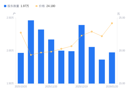 近一年(2025年1月20日至2026年1月20日),先锋电子A股股东户数从1.6万户,增加至1.97万户,增幅23.67%,区间股价上涨53.27%。