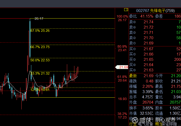 先锋电子,还是熟悉的老朋友,一动就好加速的主~这里看一张周图:趋势,红白两条多空线对应13.3-13.18上看多,价格叠加百分比显示,53.75下跌的875位对应14,近循环的半分对应14.56,14-14.56构成当前价格关键区;能突破站到14.56上方,则波段有去19.25-19.68的预期。当前支撑14,短压14.56,突破...